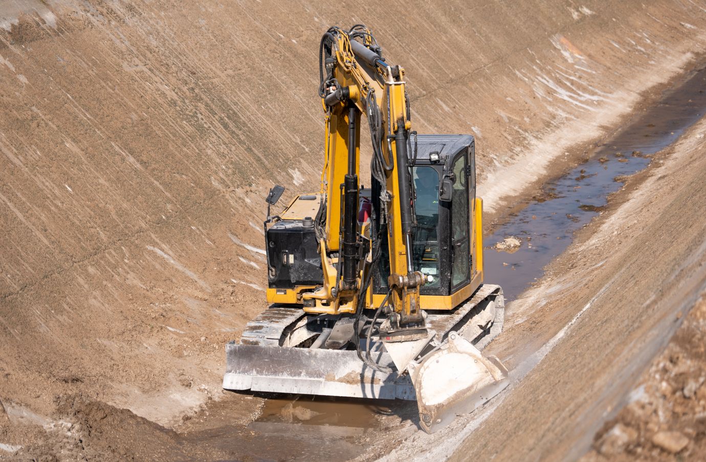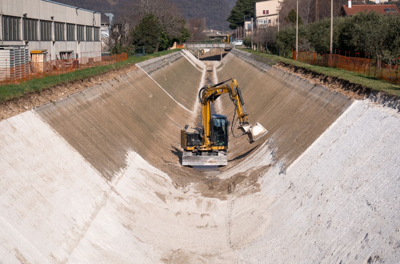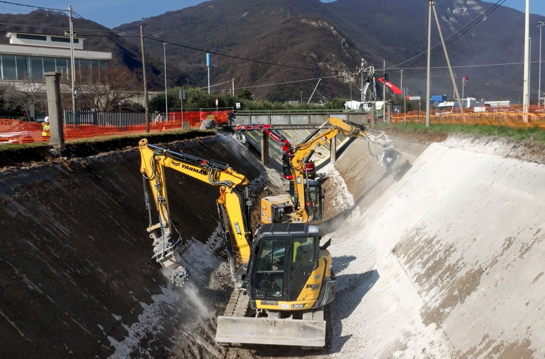 L’elevata inclinazione dell’alveo e la geometria del canale non consentivano l’impiego di macchine operatrici di grandi dimensioni. La scelta è quindi ricaduta su miniescavatori capaci di operare in sicurezza e con maggiore stabilità all’interno del canale stesso.