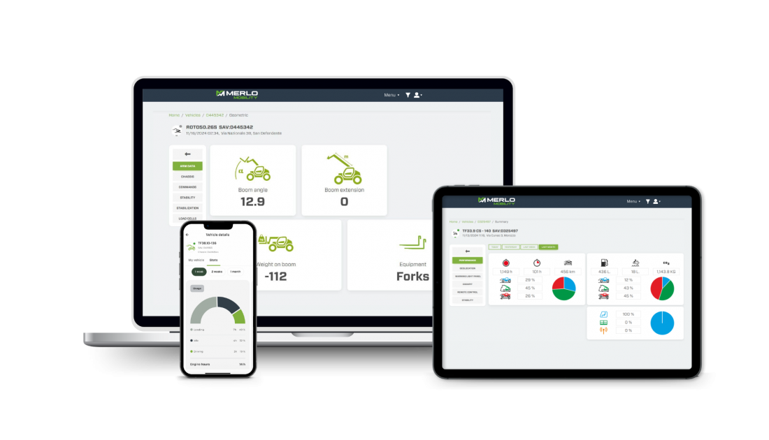 Grazie a questa tecnologia, chi possiede un veicolo Merlo oggi può raccogliere e analizzare dati fondamentali, come ad esempio mappare posizione, prestazioni, consumi, modalità di utilizzo e stato di manutenzione, ottimizzando così l'efficienza operativa della propria flotta e riducendo al minimo gli eventuali costi dovuti al fermo macchina.