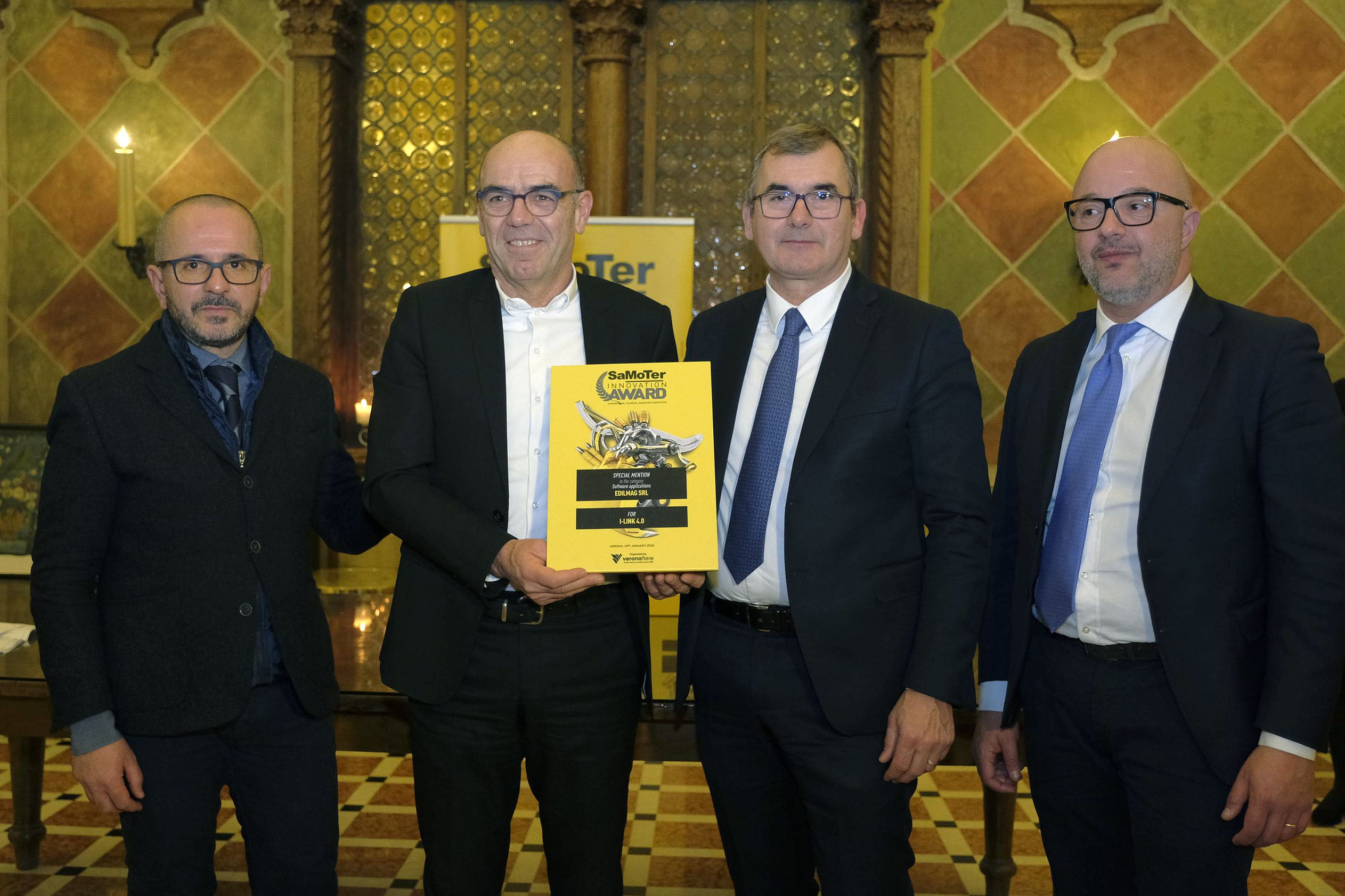 Nella foto da sinistra: Costantino Radis, presidente giuria SaMoTer Innovation Award - Rodolfo Brandi, Ceo Edilmag - Maurizio Danese, Veronafiere President - Luciano Rizzi, Veronafiere Exhibition Manager