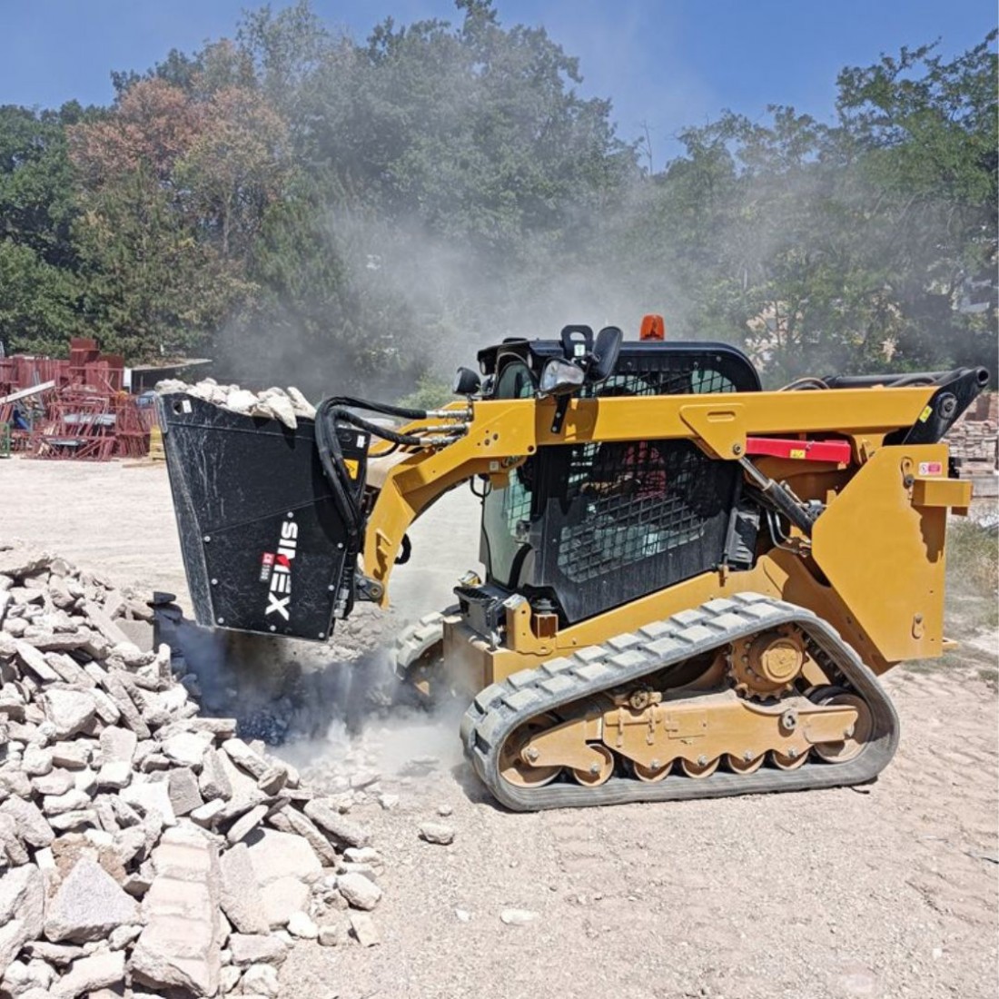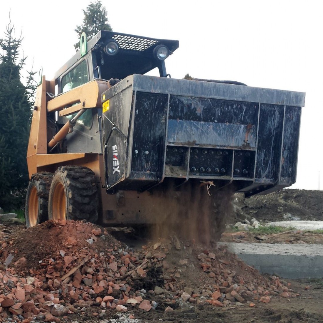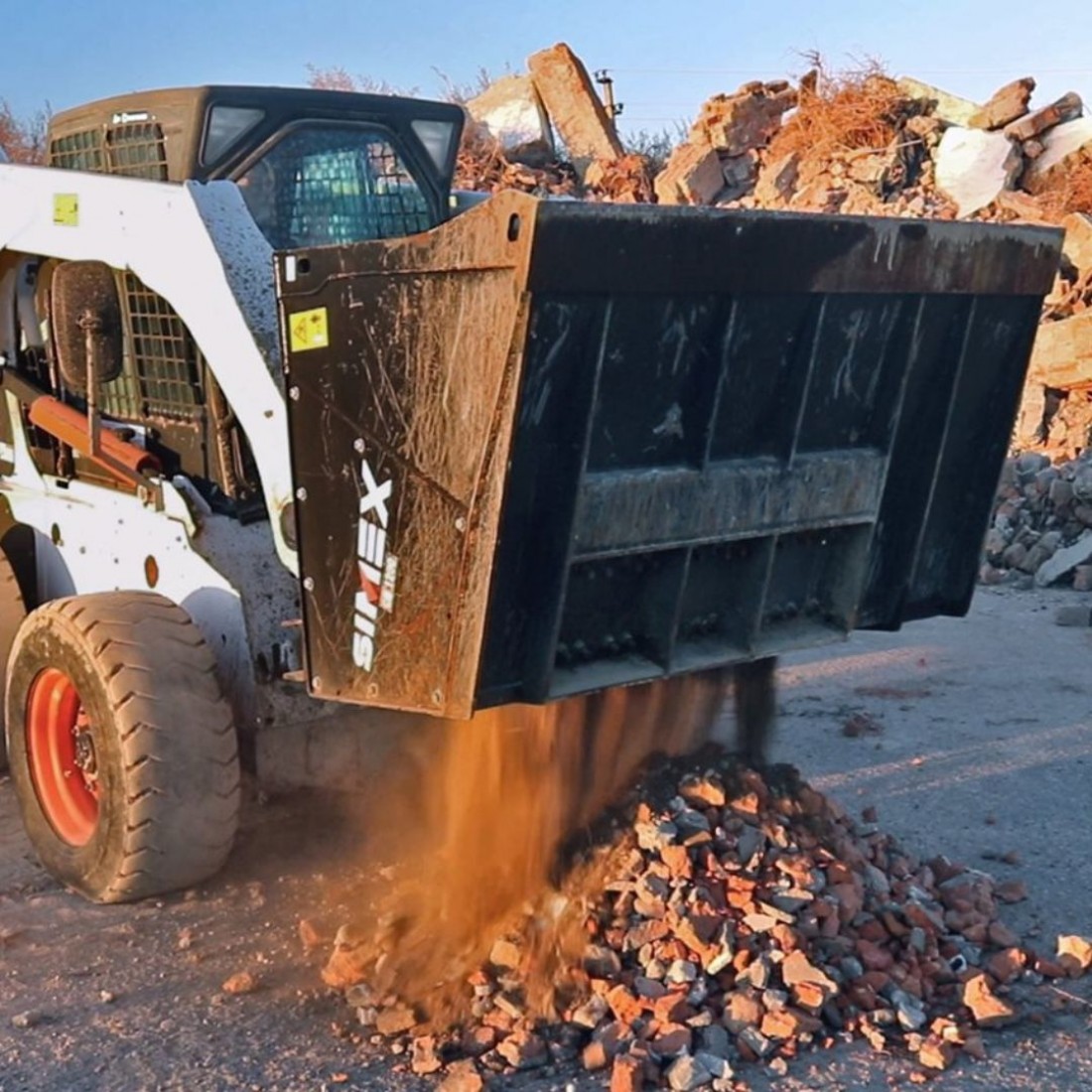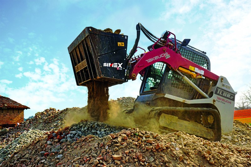 Le benne frantumatrici per attacco frontale Simex CB sono progettate per la riduzione volumetrica degli inerti direttamente in cantiere e sono ideali per la frantumazione di cemento armato e materiali da demolizione. Il sistema a rotore di cui sono dotate e l’elevata forza al dente generata, permettono di lavorare in maniera ottimale in presenza di ferro, roccia, terra e parti deformabili, umide o bagnate. Il rotore con denti è azionato da motori idraulici a pistoni radiali, di grande cilindrata, in presa diretta. Un sistema automatico inverte la rotazione del tamburo per evitare bloccaggi e fermi macchina.