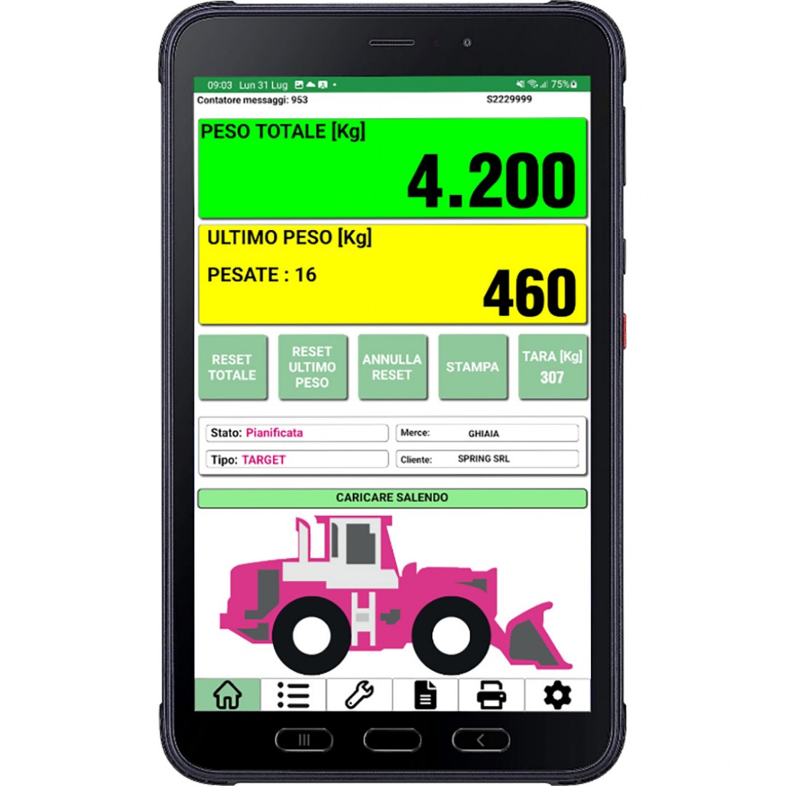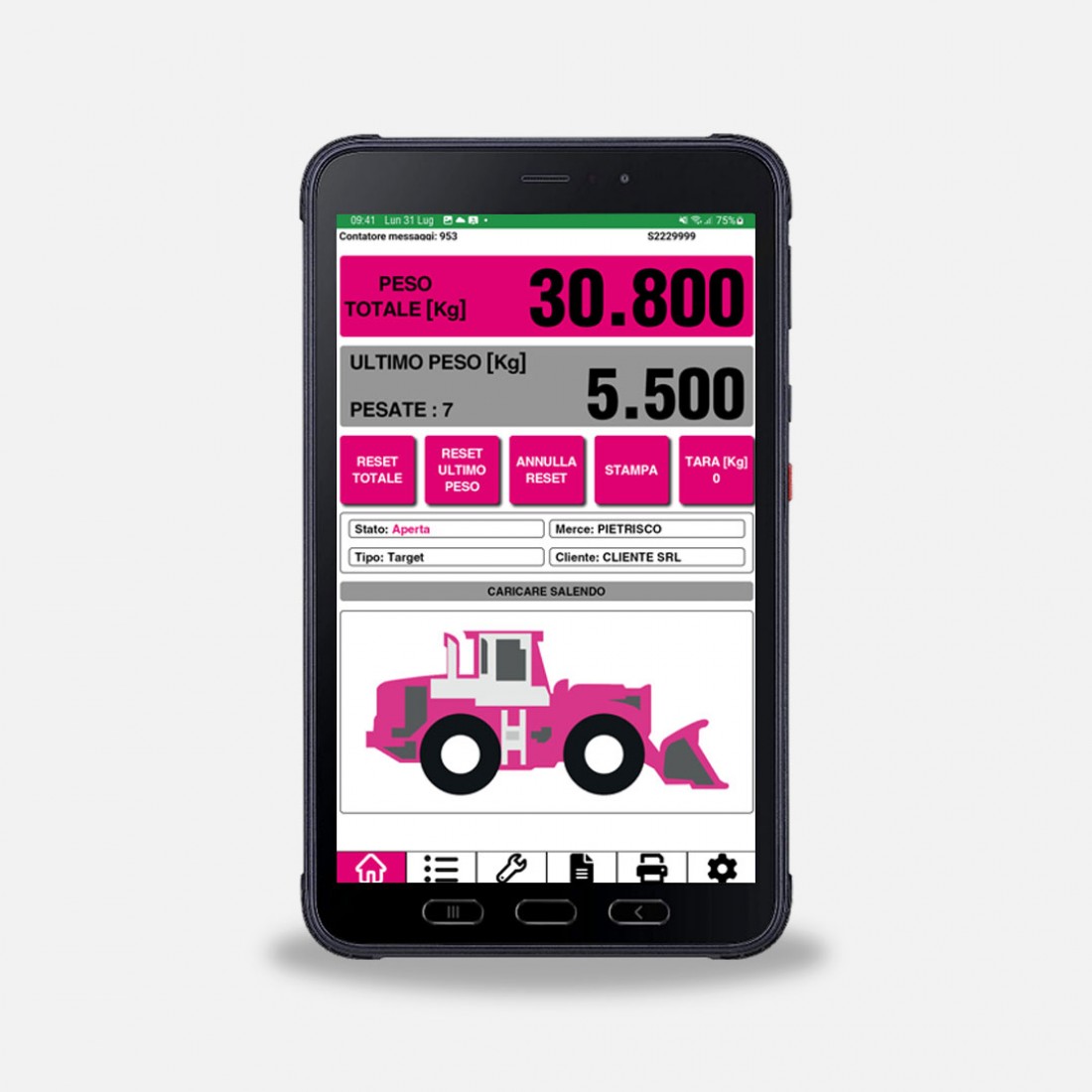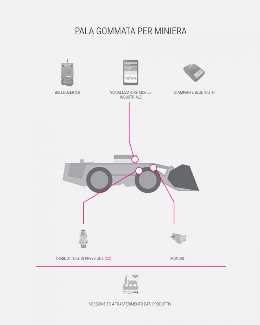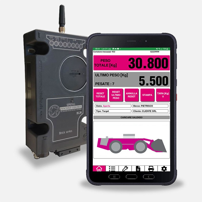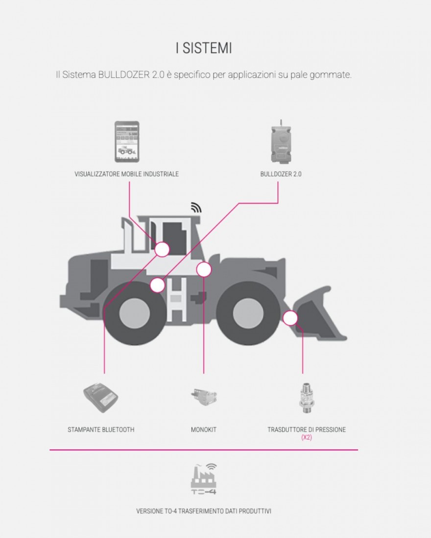 - BULLDOZER I4.0, sistema di pesatura conforme ai requisiti dell’Industria 4.0 e che permette di accedere all’Iper-Ammortamento del 250% del valore della macchina. Dotato di connessione GPS/GPRS, arricchisce il sistema di pesatura con molte funzioni tra cui l’interconnessione tra l’ufficio e la macchina, con invio di commesse e ricezione dei dati di produzione, la diagnostica da remoto del sistema, la ricezione di notifiche in caso di malfunzionamento o di allarmi personalizzabili.